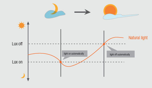 When ambient brightness is higher than preset lux level, light will automatically turn off. When is lower than preset lux on level, light will turn on 100%.
